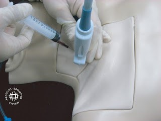 Anestesiar o local da punção observando a ponta da agulha na tela do ultrassom. O aparelho pode ajudar a orientar a anestesia de modo a evitar punção inadvertida de vasos ou administração excessiva de anestésico, o que poderia distorcer a anatomia local.